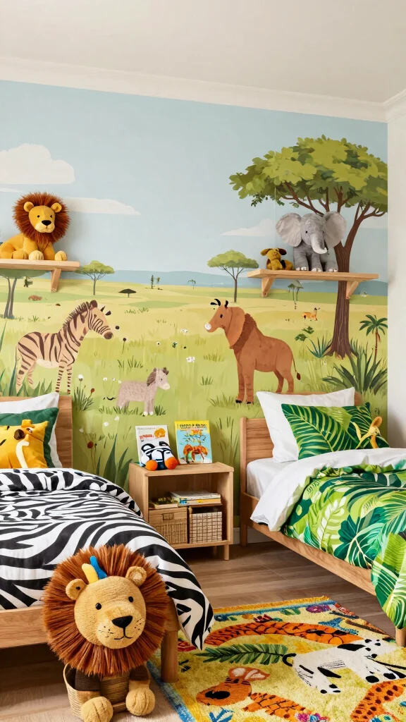 To make this theme truly pop, consider using earthy tones like greens, browns, and yellows. Budget-friendly alternatives include DIY animal-patterned cushions and rugs for added comfort. This design connects to a broader trend of nature-inspired decor, enriching your child’s understanding of wildlife.
