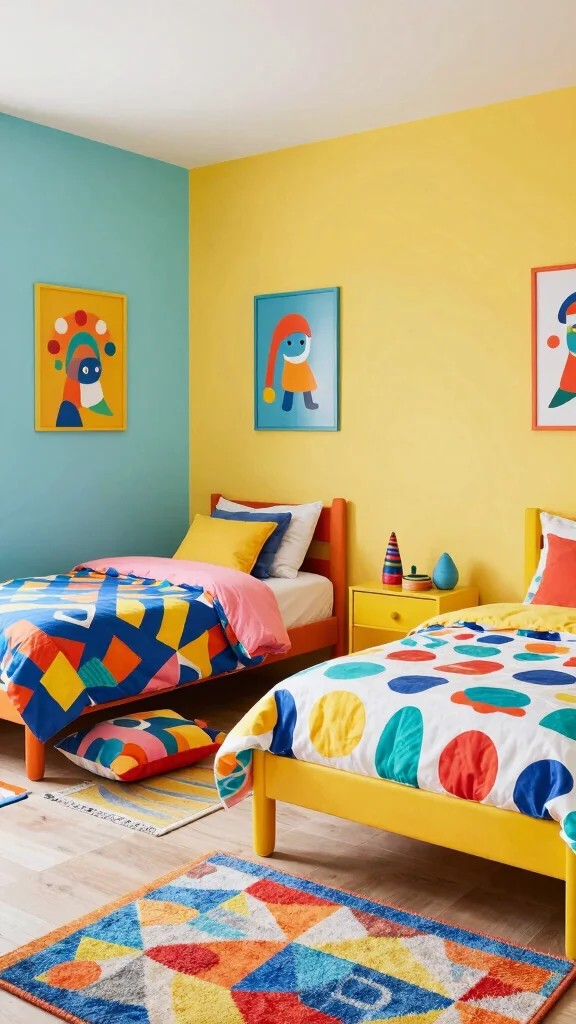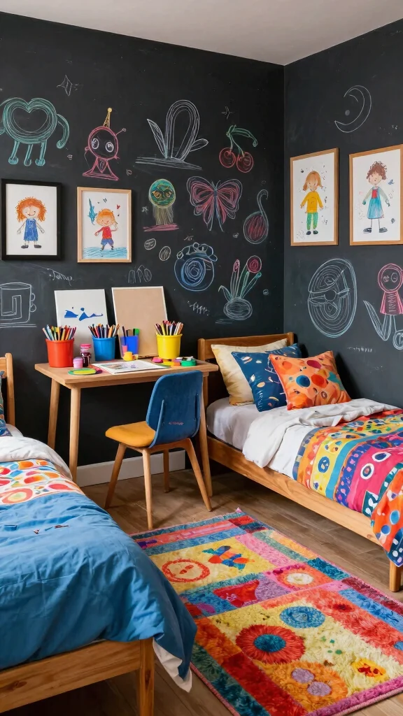 To design this vibrant haven, consider adding a large chalkboard wall for endless creative expression. Set up an art station with supplies organized in colorful bins, making it easy for them to access their tools. This theme not only promotes creativity but also strengthens sibling collaboration on projects.
