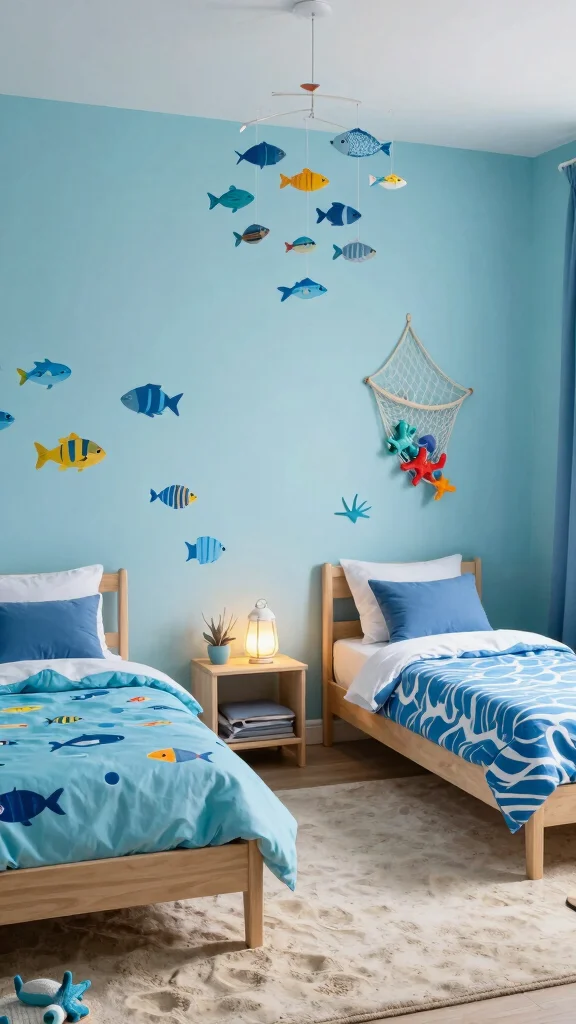 – Hang colorful fish mobiles above the beds for a whimsical touch.