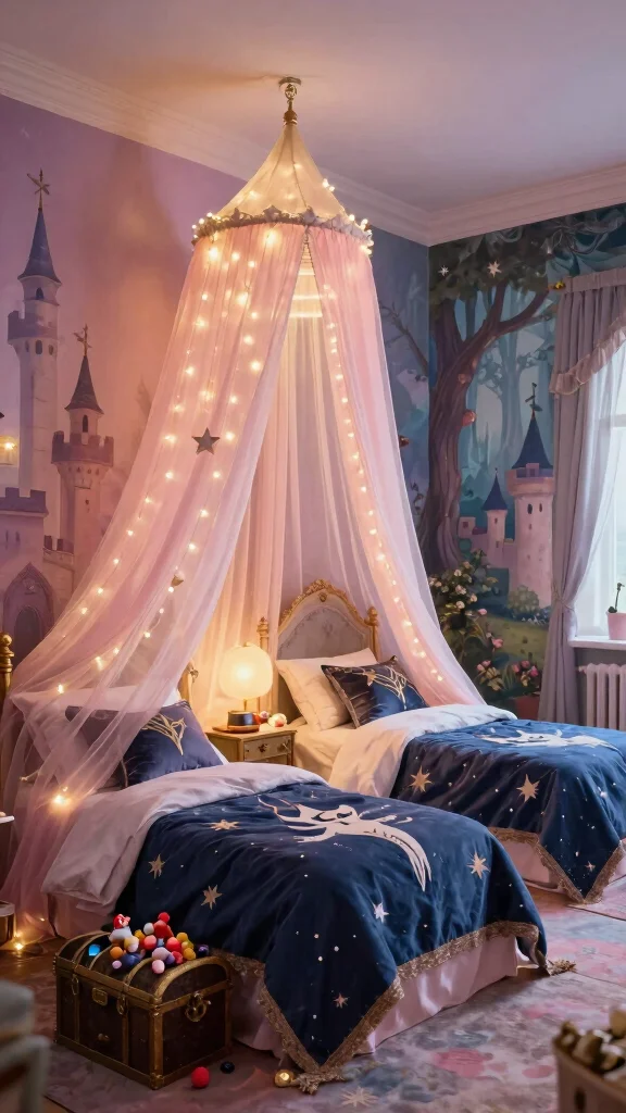 To enhance this royal theme, consider DIY projects like a canopy made from tulle over the princess’s bed. Incorporate fun elements like a knight’s armor display for imaginative play. This design encourages creativity and storytelling, promoting sibling bonding.