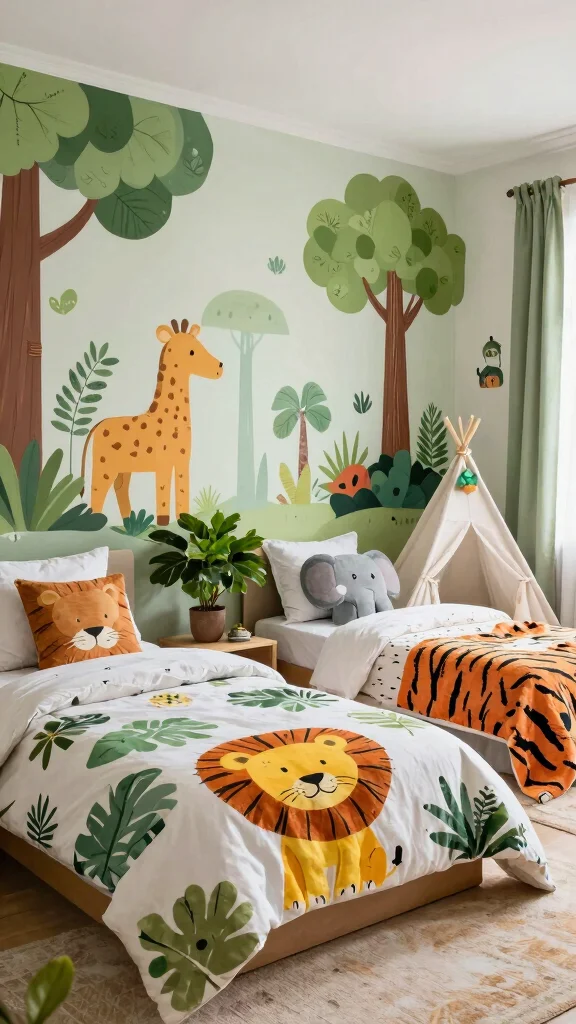 Imagine stepping into a lively jungle safari-themed bedroom, where every corner bursts with adventure! This design is perfect for sparking imagination as cozy beds nestle amidst lush greenery and playful animal motifs. Personalize each bed with themed bedding showcasing lions, tigers, and elephants for an immersive experience. Bright wall decals of trees and jungle animals bring the magic of the rainforest indoors, creating a vibrant atmosphere for kids to explore and dream.