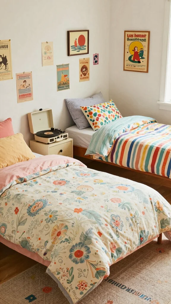 This retro theme invites creativity and nostalgia, making it a perfect blend for siblings sharing a room!