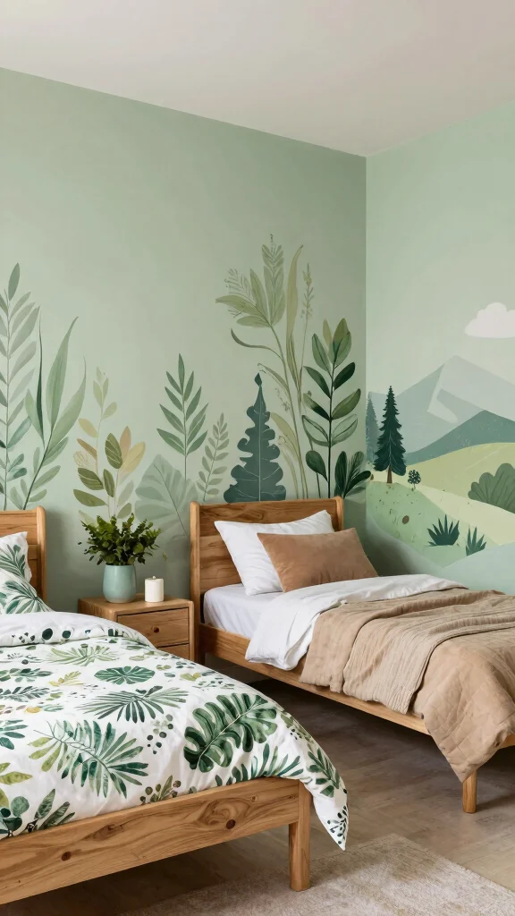 Create a serene nature-inspired retreat that seamlessly brings the outdoors in! Soft earthy tones and natural materials evoke a sense of peace and tranquility. Each bed can be adorned with leafy prints and nature themes, while a nature mural or decals featuring trees or landscapes enhance the calming atmosphere.