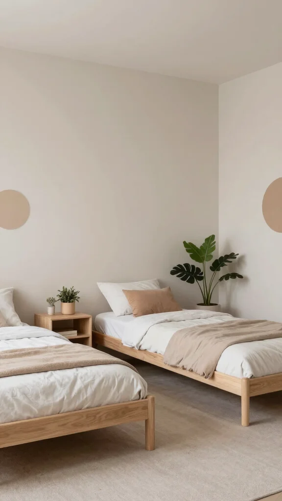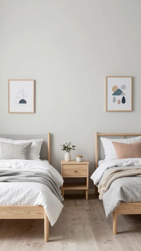 To enhance this theme, use framed artwork that represents nature or geometric patterns to inspire creativity. Include cozy blankets and cushions for added warmth, creating a relaxing reading corner with a small bookshelf. This design resonates with the current trend of minimalism, fostering a serene space for siblings.