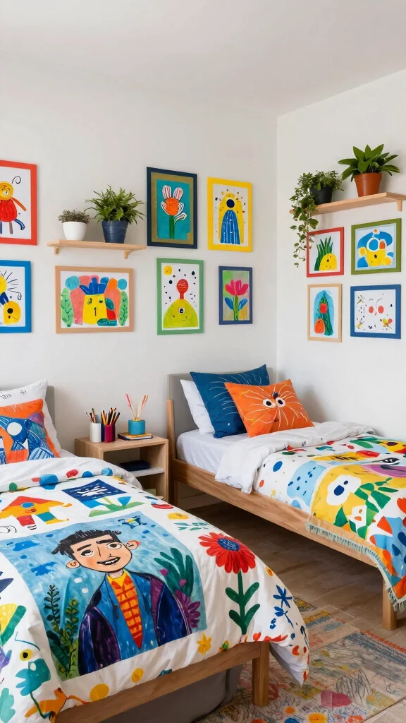 Transform your kids’ bedroom into a personalized gallery that showcases their unique creativity! Each bed area can highlight different art styles and interests, allowing their personalities to shine through the decor. Colorful bedding featuring their favorite artists or art styles complements the walls, which can display their artwork for everyone to admire.