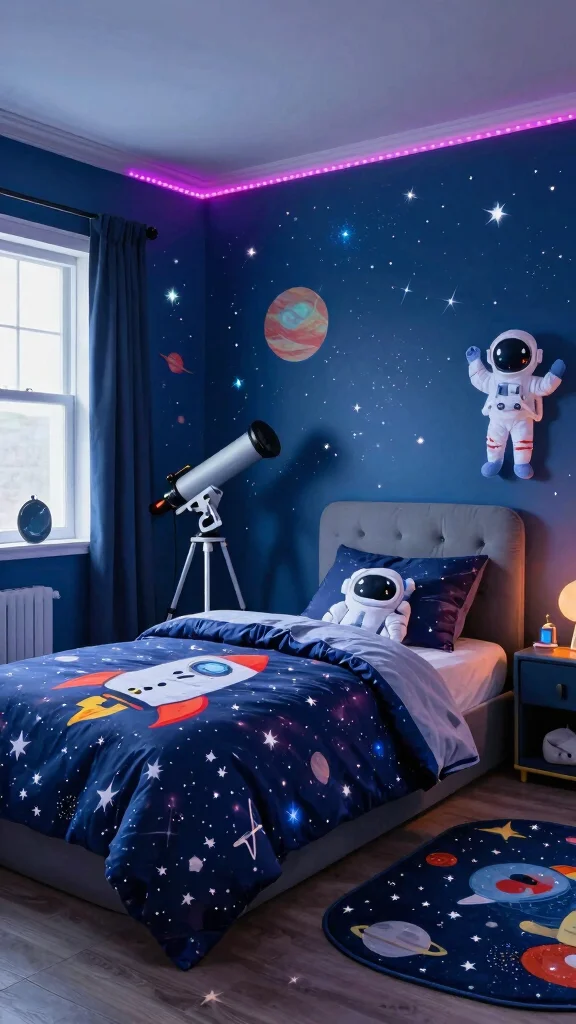 For practical implementation, consider using galaxy-themed curtains that block light for better sleep. To encourage stargazing, place a telescope by the window for nighttime explorations. Tapping into the trend of immersive environments, this theme not only excites but also opens up discussions about science and exploration.