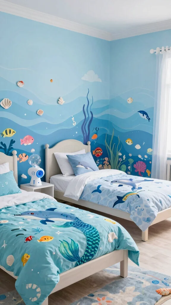 Dive into an enchanting underwater-themed room that celebrates the beauty of ocean life! This design is perfect for children who adore the sea and its wonders. Paint the walls in soothing shades of blue, adorned with wave patterns to evoke an undersea atmosphere. Each bed area can be decorated with nautical-themed bedding featuring colorful fish, playful dolphins, and vibrant coral, while seashell garlands and mermaid accents bring the ocean’s charm indoors.