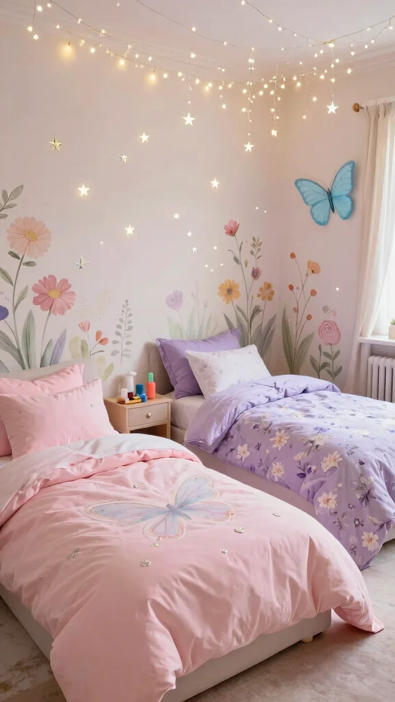 To enhance the fairyland theme, drape tulle or soft fabric around the beds to create a canopy effect. Incorporate shaped soft rugs for added comfort and set up a craft corner decorated with fairy-themed supplies. This design taps into the broader trend of fantasy-inspired decor, fostering creativity and joy.
