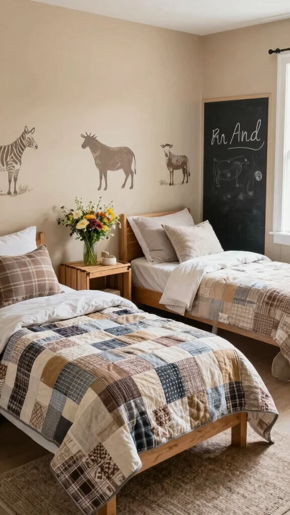 To enhance this theme, consider using wooden crates as bedside tables for a rustic touch. Add a chalkboard wall for creative expression and incorporate nature-themed decor like flower bouquets. This approach resonates with the current trend of cozy, homey spaces, fostering a sense of togetherness.