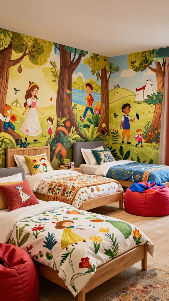 Bring the magic of storybooks to life in a whimsical bedroom that celebrates adventure and fantasy! Each bed can feature beloved characters from classic fairy tales to modern adventures, creating an atmosphere filled with excitement. Use vibrant colors and playful patterns to evoke joy, while wall murals depicting scenes from favorite stories enhance the enchanting vibe.