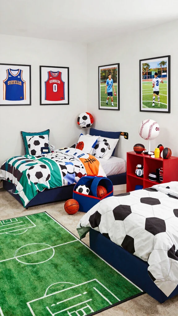 For fun features, create a sports-themed gallery wall with action shots and incorporate a mini sports court rug for playful energy. This design connects with the current trend of personalized spaces, encouraging kids to express their interests and hobbies.