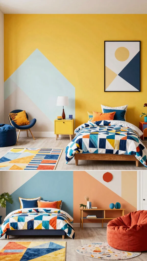 To implement this theme, consider using a mix of geometric rugs to define each sleeping area. Incorporate colorful furniture that aligns with the geometric theme and add unique-shaped bean bags for extra seating. This approach reflects the current trend of playful, modern designs, creating an exciting environment for kids.