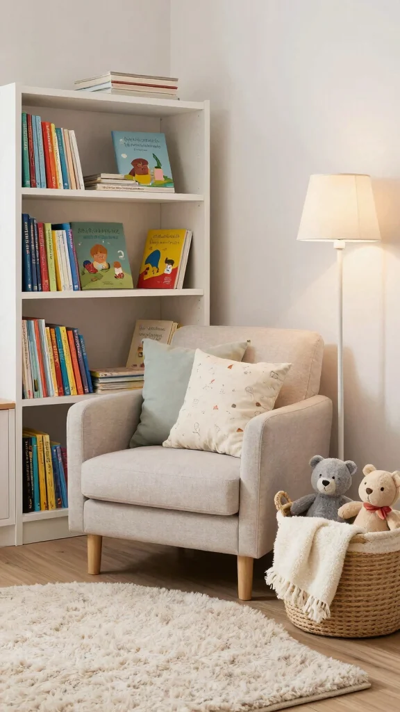 A well-arranged bookshelf filled with colorful children’s books, plush toys, and framed memories makes it warm and welcoming. Adding a soft rug for your child to sit on while you read can enhance the area, and a floor lamp or small table can provide practical lighting for bedtime stories.
