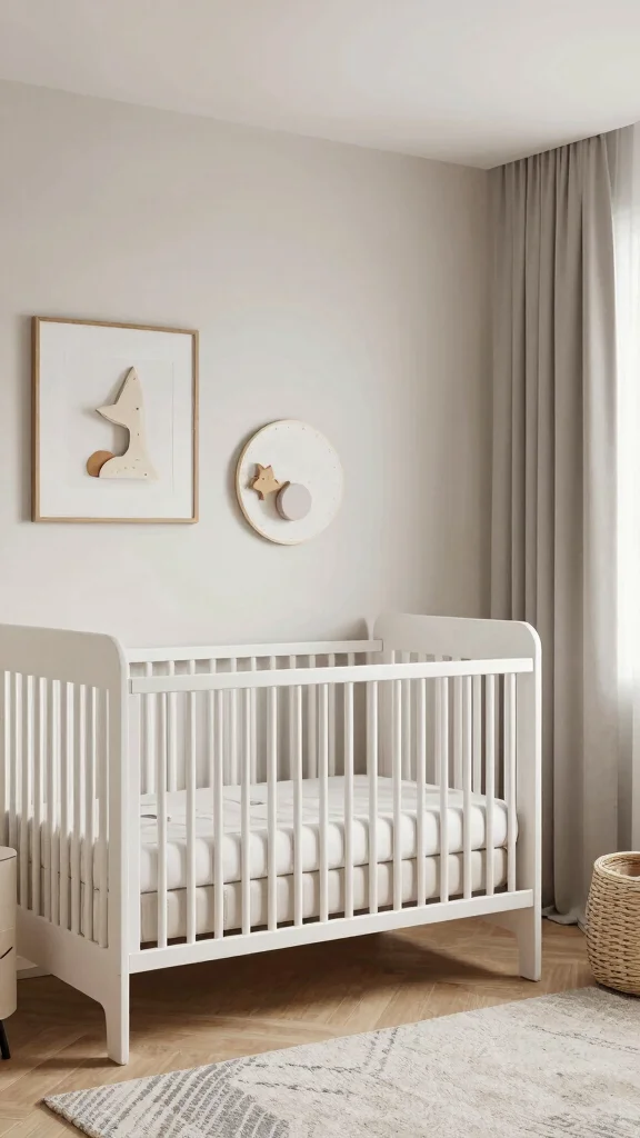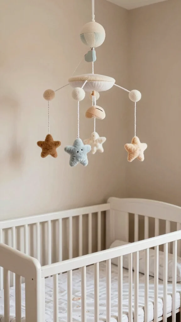 A minimalist mobile in soothing colors can enhance the calming atmosphere while providing movement and interest for your little one. Hang it at the ideal height for your baby to enjoy its beauty clearly.