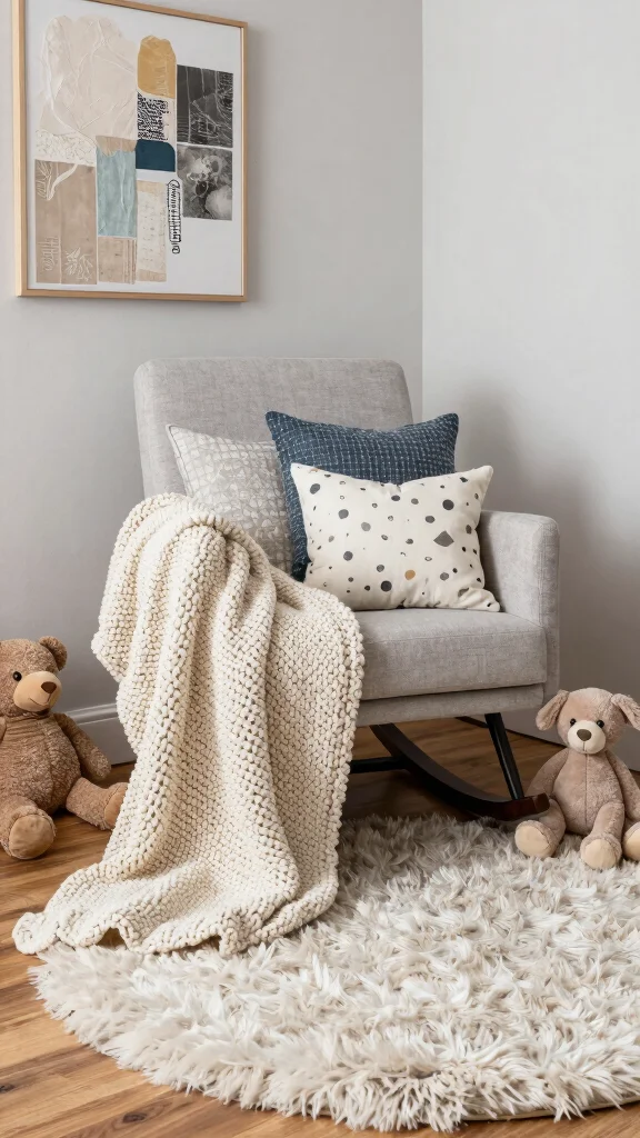 A chunky knit blanket draped over a chair, a fluffy area rug underfoot, and textured cushions can all work in harmony to create a welcoming space for both you and your baby. These elements also provide sensory stimulation for your little one as they grow.