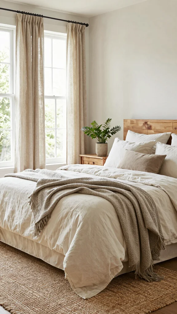 To implement this chic aesthetic, layer rich neutral tones that promote relaxation and calm. Mix various textures, such as a smooth cotton duvet paired with a cozy chunky knit throw, for added depth and warmth. You can find these beautiful textiles through local artisans or sustainable brands, ensuring your bedding is unique and supports ethical practices.