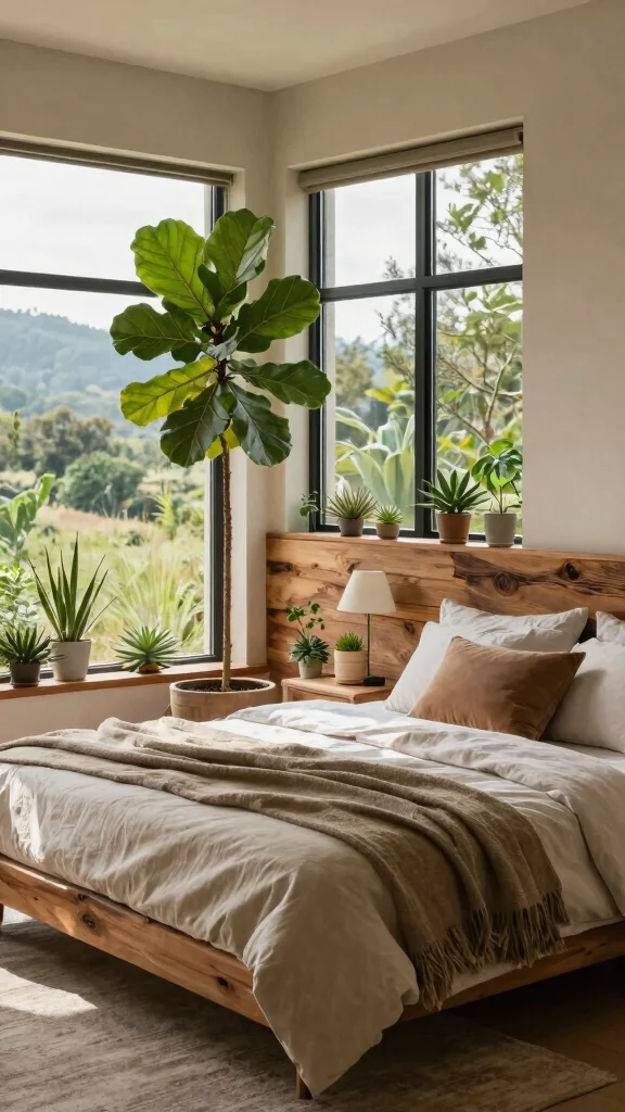 To embrace this trend, opt for larger indoor plants, such as fiddle leaf figs or snake plants, which purify the air and provide vibrant splashes of green. Enhance the natural ambiance with reclaimed wood elements, like a striking headboard or decor pieces, and maximize your windows to flood the room with sunlight. The result is a master bedroom that feels alive and rejuvenating.