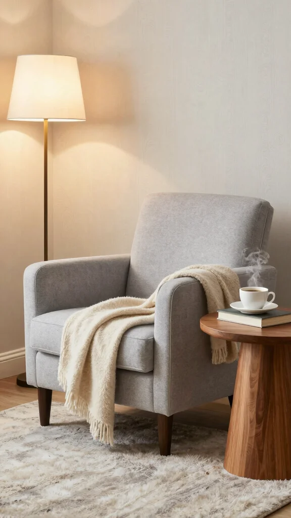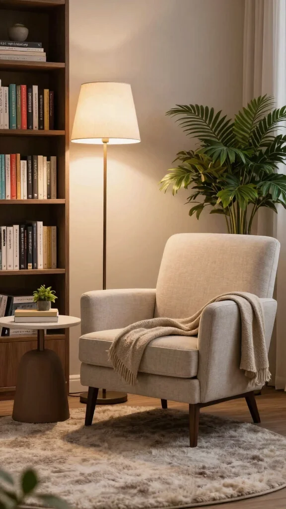 For practical touches, consider a stylish floor lamp to illuminate your reading materials. Use decorative pillows and a cozy throw to make the seating area inviting. Adding a small bookshelf for your favorite reads will personalize the space further.