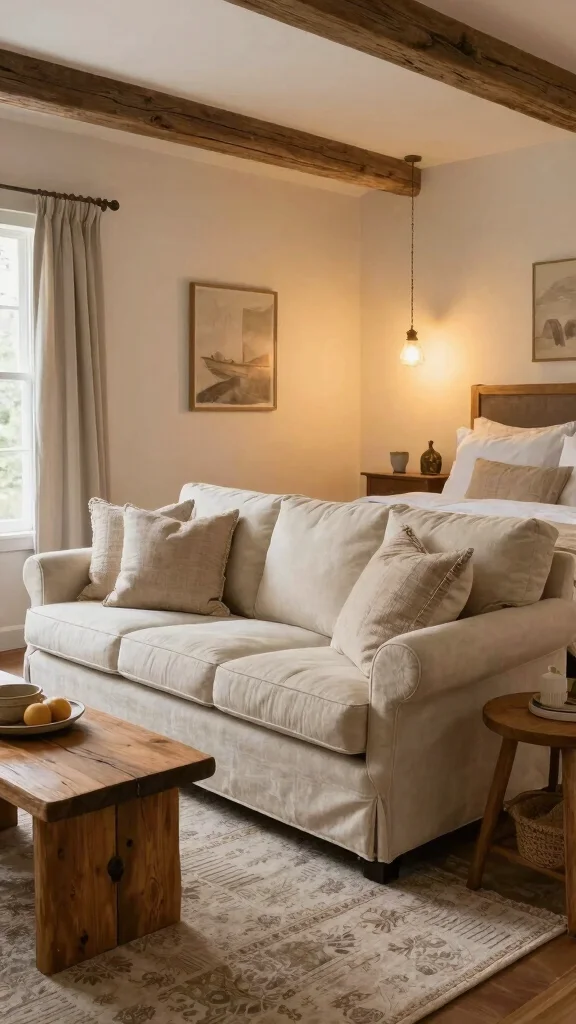 Embrace the charm of farmhouse design by creating a chic seating area that blends comfort with rustic elegance. Consider a vintage-inspired sofa or a pair of cozy chairs adorned with soft fabrics and natural wood accents. This style creates an inviting atmosphere that feels both luxurious and homely.