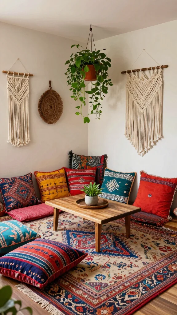 For a touch of playful charm, consider creating a whimsical bohemian seating area. Layered rugs, a low coffee table, and a mix of colorful cushions create a vibrant and relaxed space. Enhance the bohemian vibe by hanging macramé or woven wall art nearby, inviting creativity and warmth into your room.
