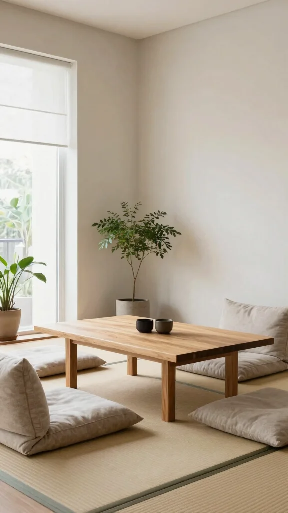 Embrace tranquility with Japanese-inspired minimalist seating that fosters a serene atmosphere. A low table surrounded by floor cushions allows for a grounded experience, perfect for relaxation and contemplation. This design choice creates a peaceful environment that feels inviting and calm.