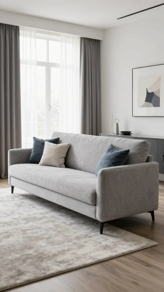 To enhance the minimalist vibe, opt for neutral colors for a calming effect, or choose a bold hue for a striking statement. Adding a few decorative pillows can introduce a pop of color or texture, while positioning the sofa on a plush area rug creates a distinct area in the room.
