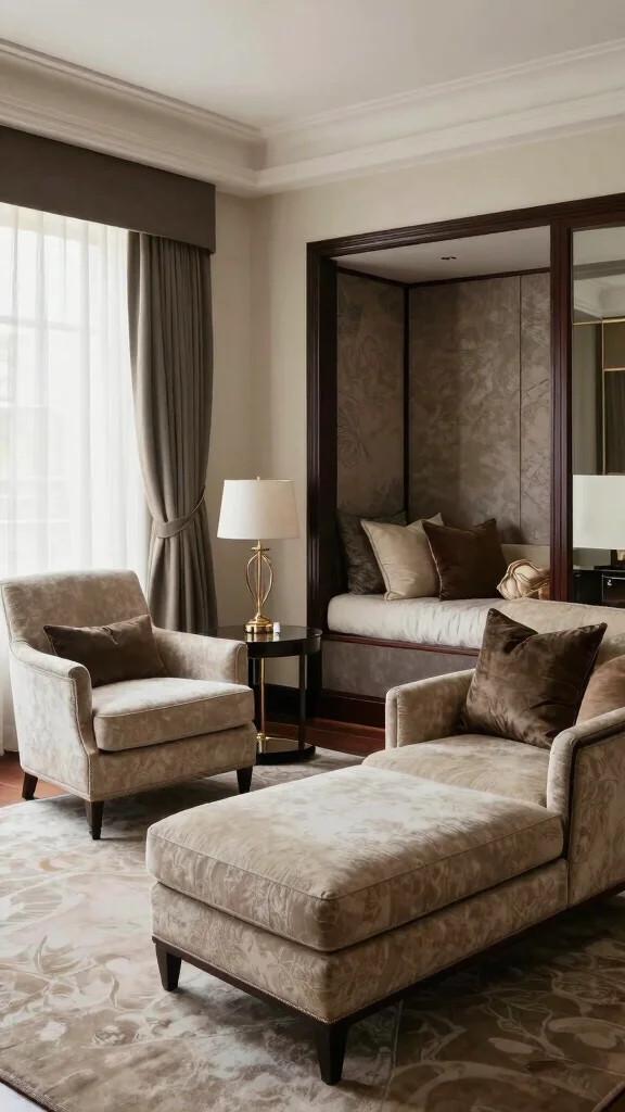 Fabrics and finishes set the mood for a high-end feel. Opt for tactile luxury bedroom seating fabrics like velvet, bouclé, or performance-grade materials that stand up to daily life. Leather or faux leather can add a sophisticated edge. Stick to a warm, cohesive color palette (creams, taupes, champagne) and use metallic accents or wood tones to add depth. For easy maintenance, choose cushions with removable covers or washable covers. Pair durable materials with rich textures and you’ll get a cozy master suite decor that still reads as stylish bedroom furniture.
