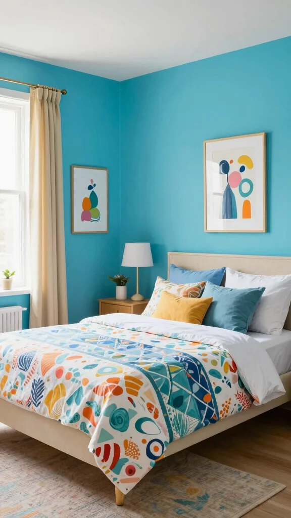 Consider using bright blue for accent walls or bedding to create an eye-catching pop of color. Pair it with light furniture to maintain an airy feel, and add playful decor to enhance the lively atmosphere.