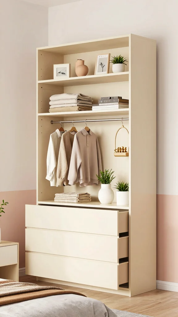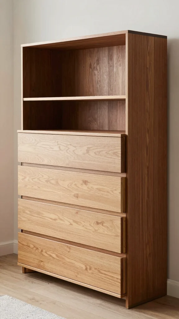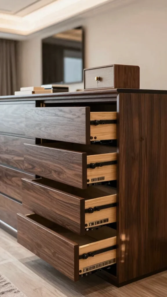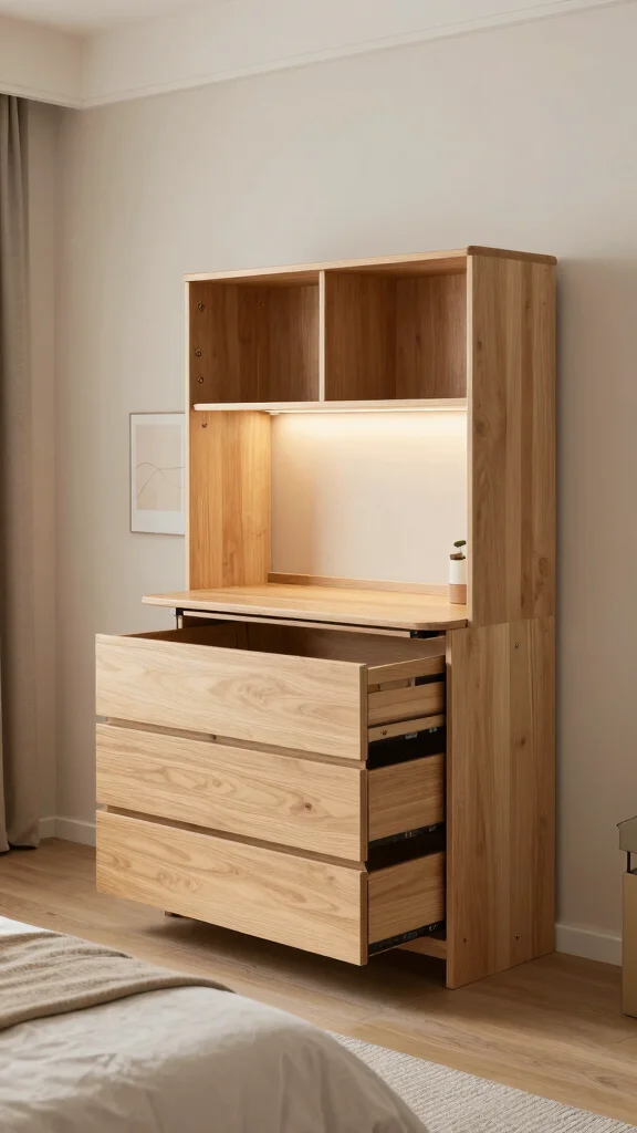 Consider integrating hidden compartments for electronics or personal items, ensuring that everything has its place. A foldable tabletop can easily transform your dresser into a workspace, blending practicality with style effortlessly.