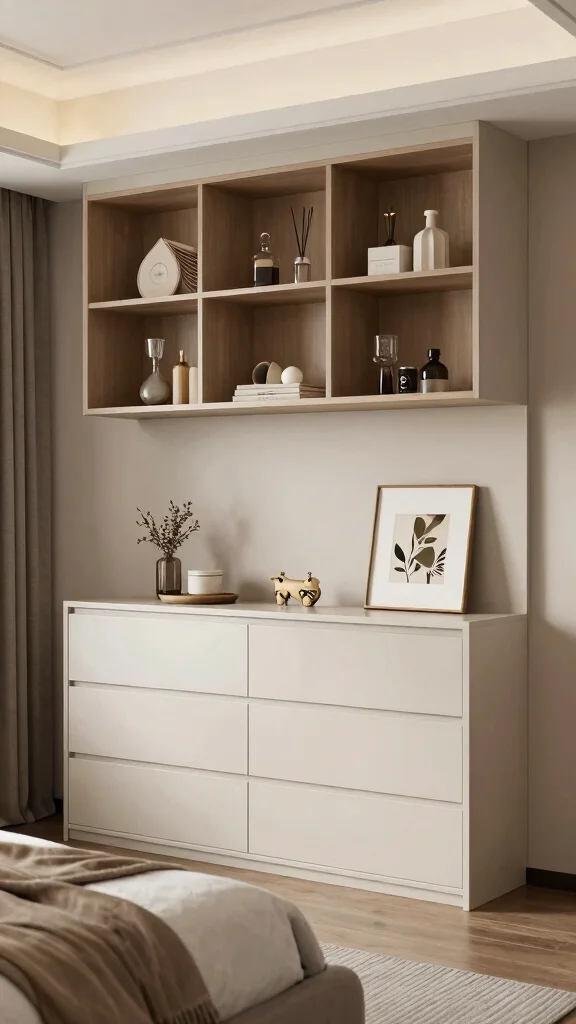 A shelved built in dresser in bedroom master suite isn’t just storage—it’s a tiny showroom. With varying shelf heights, you can hide clutter while showcasing personal items. Pro tip: use stylish boxes to organize small pieces for a clean, intentional look.