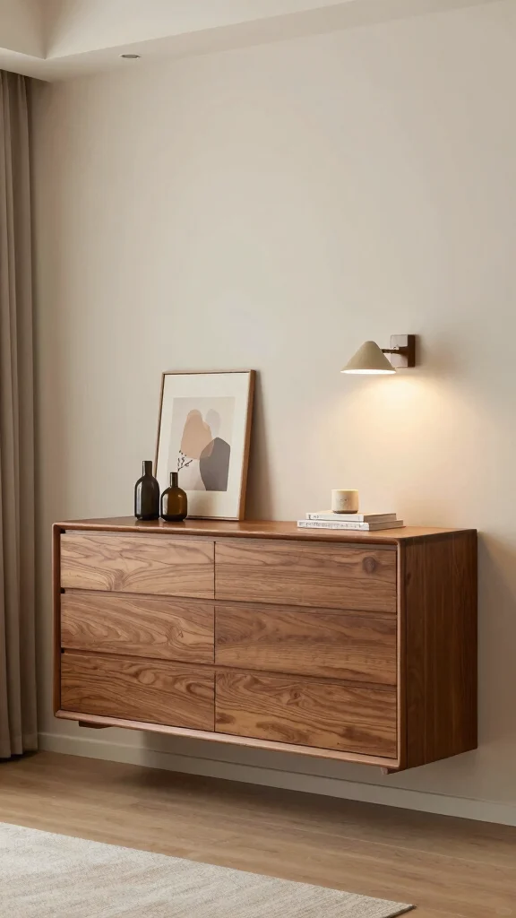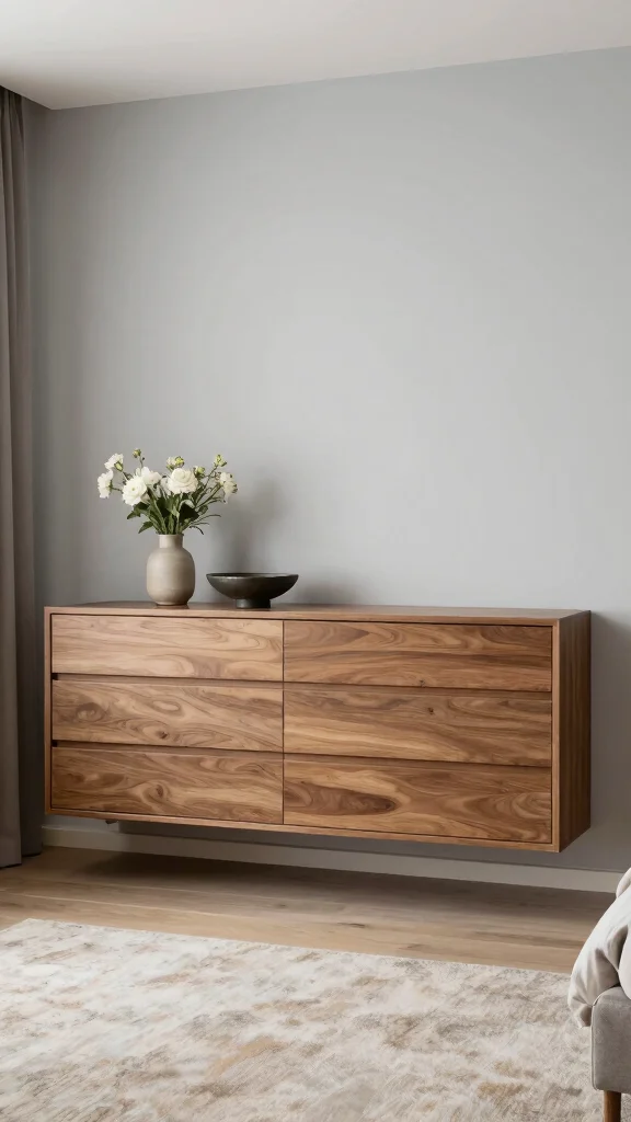 A wall-mounted dresser serves as both a practical storage solution and a stylish art piece in your master suite.