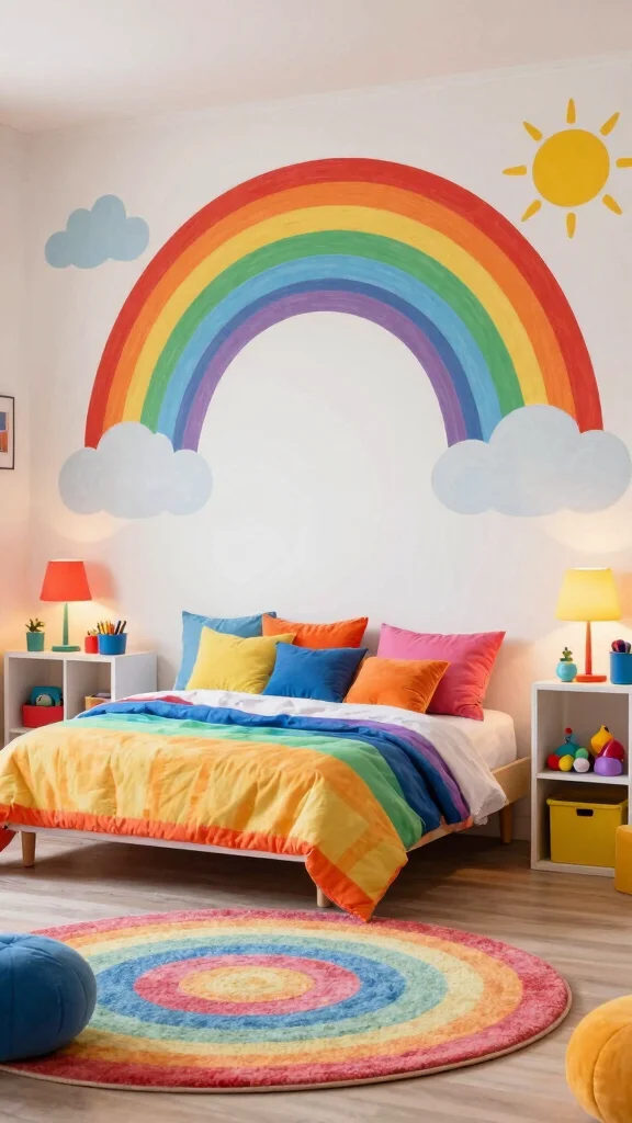 To implement this design, consider adding a rainbow bedspread that balances vibrancy with comfort. Colorful storage bins can serve both functional and decorative purposes, keeping toys organized while enhancing the theme. Here are some tips to enhance this look: