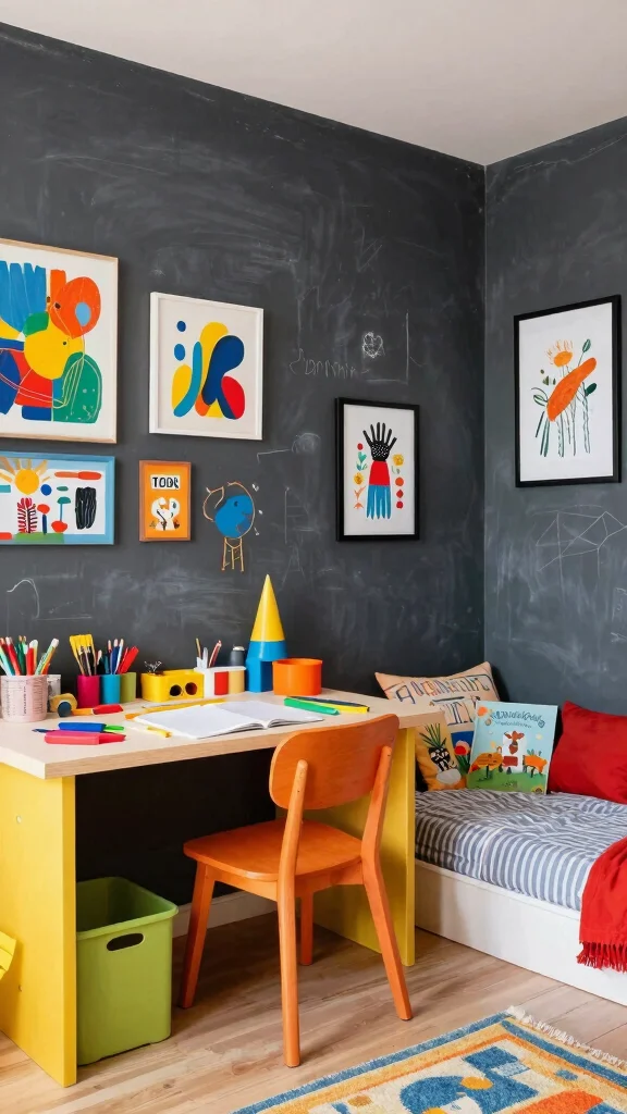 Transform your child’s room into an artistic haven filled with creativity and color. Opt for a playful palette of bright colors that inspire imagination and joy. A chalkboard-painted wall allows for spontaneous artistic expression and creativity at any moment.