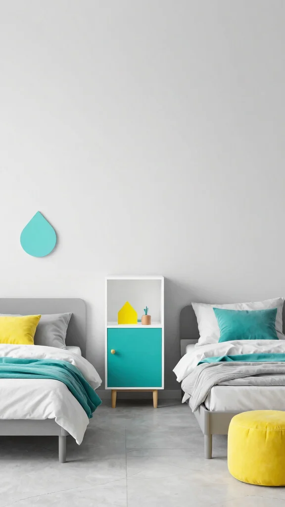 For a sleek and stylish look, consider a modern minimalist bedroom with vibrant pops of color. A neutral base of whites and grays provides a clean backdrop, allowing bold accents in colors like turquoise or sunshine yellow to shine through.