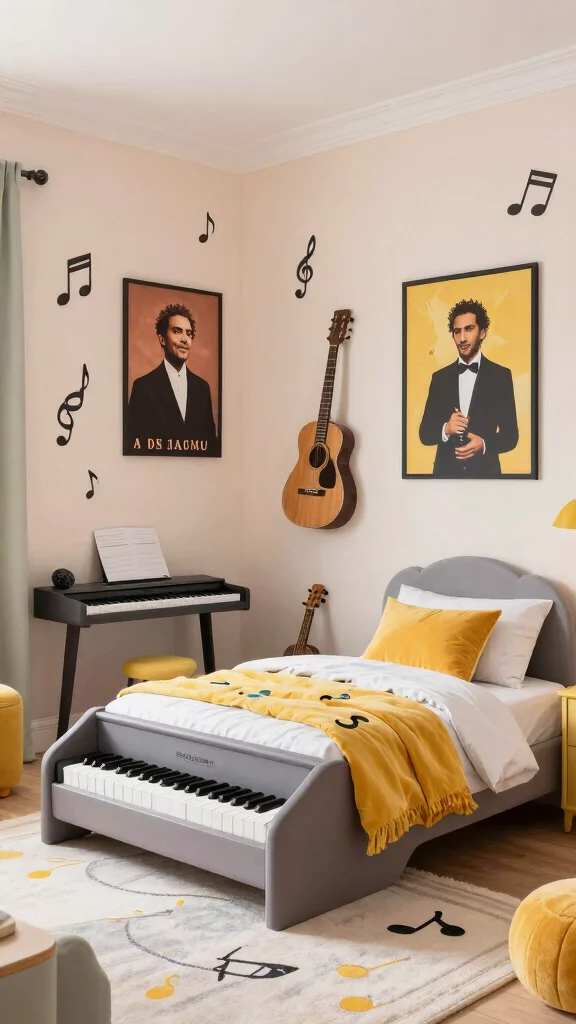 A bed shaped like a piano or musical note can become the focal point of this creative room. To enhance the musical vibe: