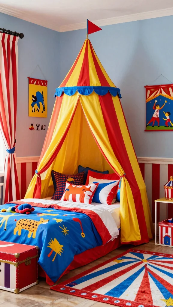 Hang a tent-style canopy over the bed to mimic a circus tent, while incorporating fun circus animal motifs in bedding and accessories for added flair. To create this lively atmosphere: