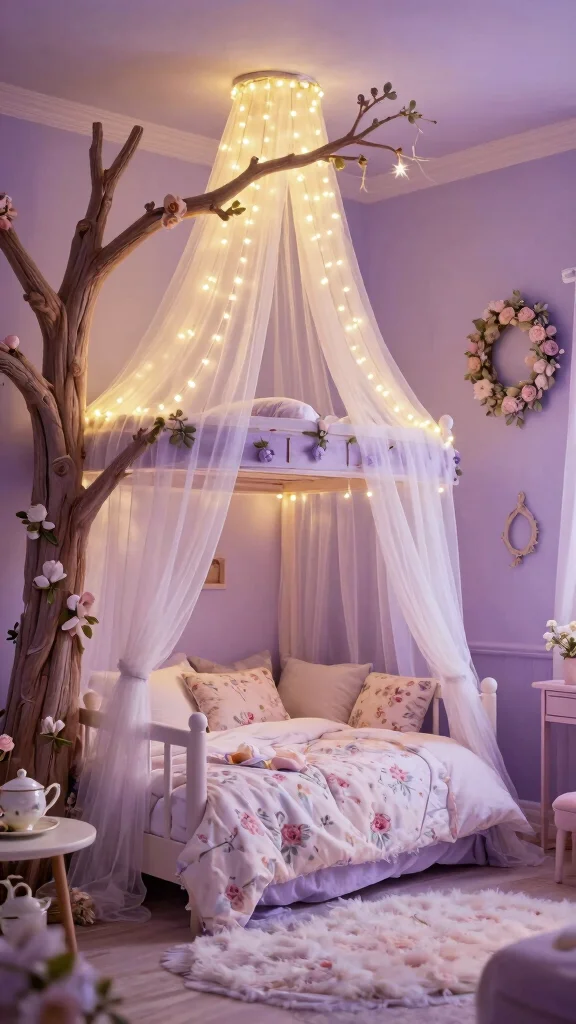 To create this dreamy atmosphere, hang tulle or fabric drapes for an ethereal effect. Floral wreaths can serve as charming wall decor, while a small tea set adds playful elegance. Here are some ideas to enhance this magical theme: