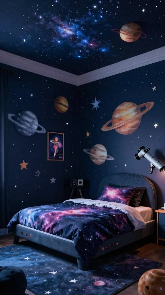 A bed shaped like a spaceship can be the focal point in this galactic wonderland. To bring this theme to life: