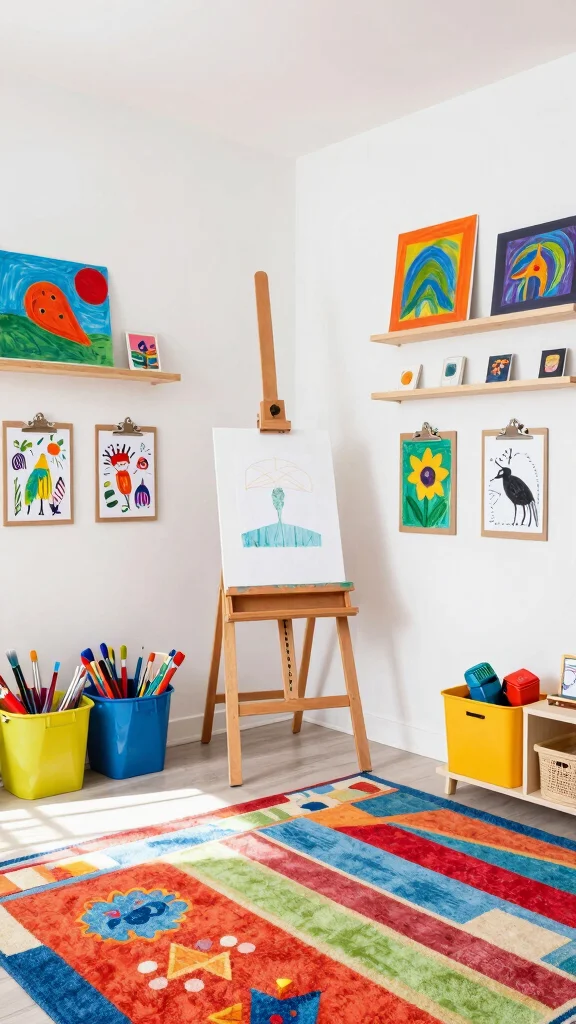 Include a craft table with supplies and colorful storage options to keep the area vibrant and fun. To complete this lively look: