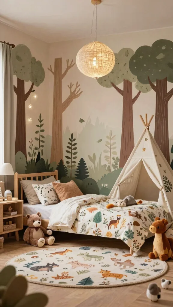 Invite the beauty of nature indoors with a whimsical woodland theme! Soft earth tones paint the walls, while tree decals or wallpaper create an enchanting forest feel. Plush animal toys and natural elements like wooden furniture enhance the comforting ambiance.