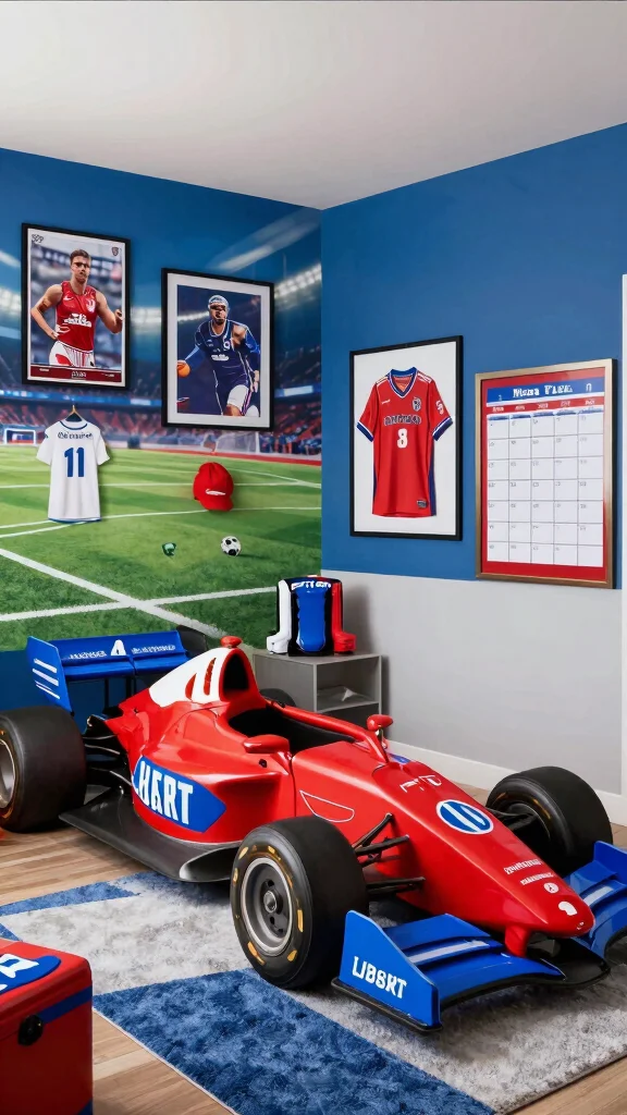 To pull everything together, incorporate athletic gear as decorative elements and paint a mural depicting a sports field or court. A bulletin board can keep schedules and achievements organized. Here are some ideas to enhance this sporty theme: