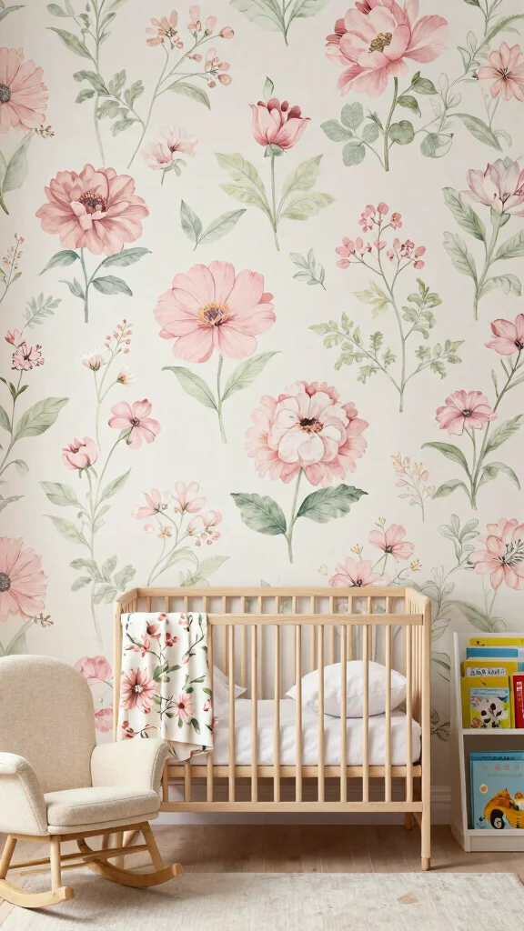 Choose vintage floral prints on textiles or as art rather than heavy wallpaper; if you use wallpaper, opt for removable decals to keep walls baby-safe.