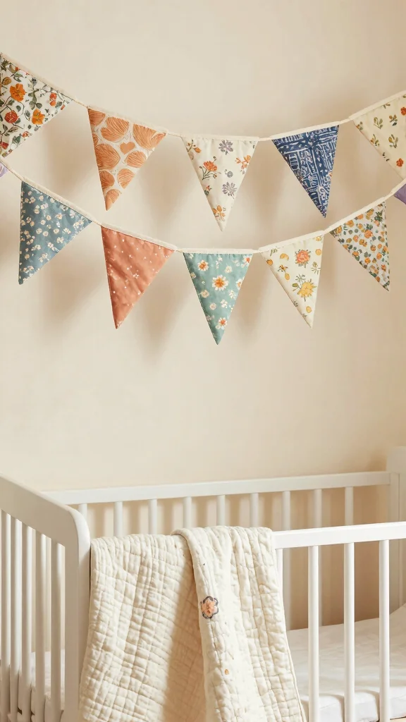 Choose fabric or paper bunting in patterns that complement your color scheme, hanging it above the crib or along the walls. This simple detail introduces a festive touch while enhancing the cozy ambiance of the space.