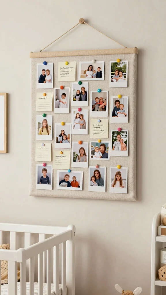 Create a bulletin board decorated with soft fabrics or natural materials where you can pin photos, notes, and memories. This decorative piece can grow with your child, displaying their first art projects and school achievements in the future.