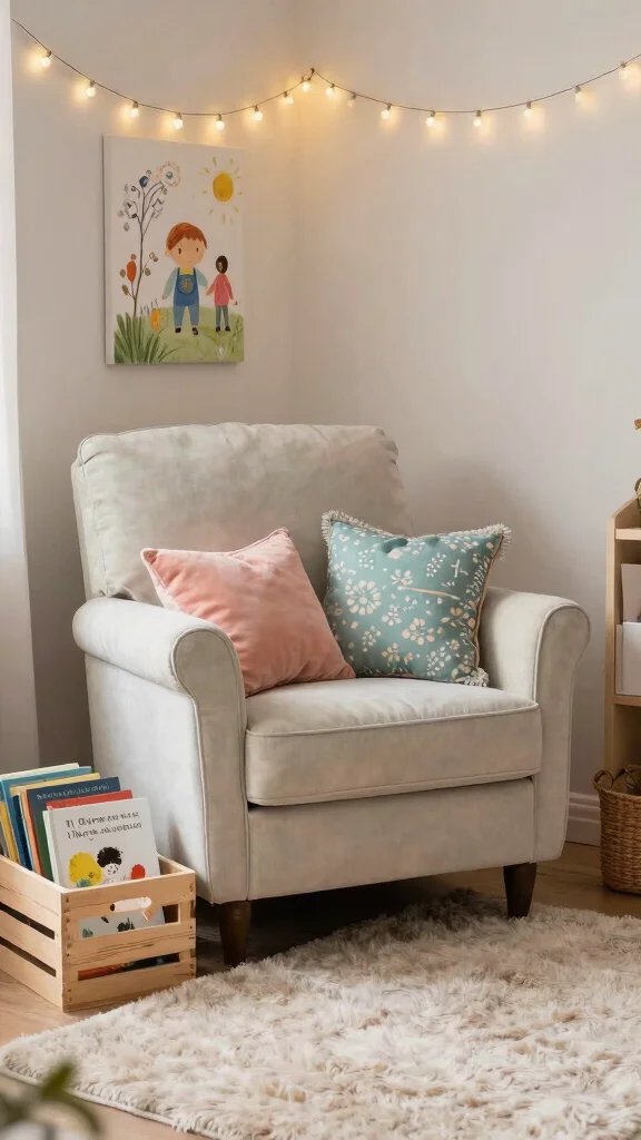 Create a comfortable corner with a plush rug, a cozy chair or small sofa, and a selection of enchanting books within easy reach. Adding a small bookshelf or wooden crate keeps the area organized while showcasing the books beautifully.