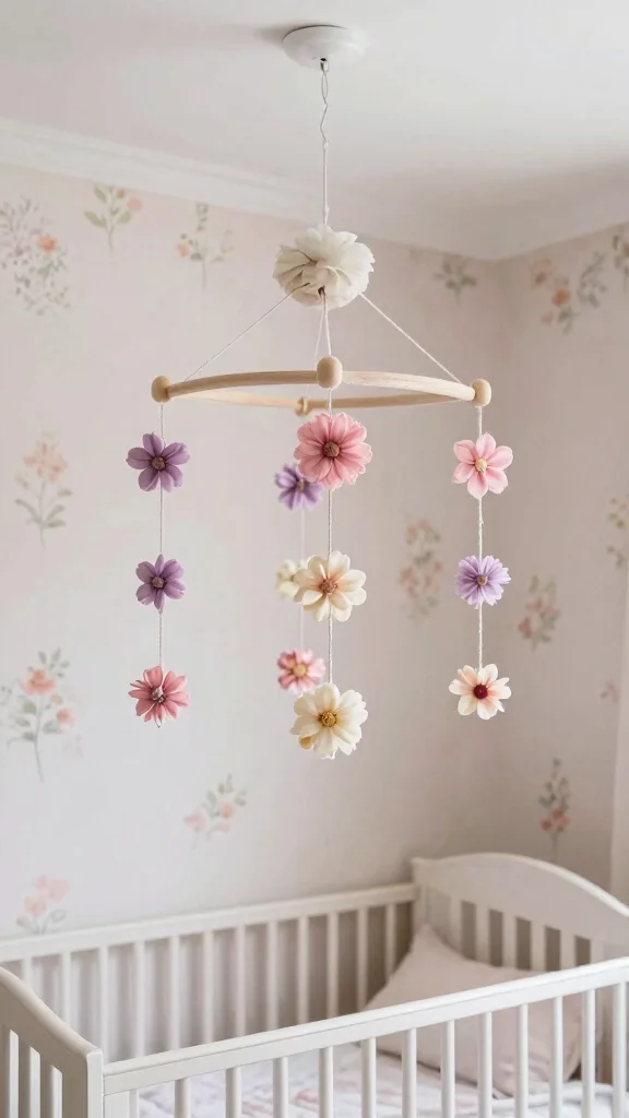 A floral mobile adds a whimsical touch above the crib, providing visual stimulation and a dreamy atmosphere.
