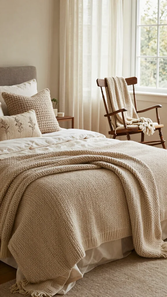 Knitted textiles are the epitome of coziness in any bedroom. Whether you opt for chunky throws or soft pillows, these elements introduce warmth and texture that instantly make the space feel inviting. Drape an oversized knit throw over a chair or layer it on the bed to enhance the cozy atmosphere, while nubby pillows in varied colors bring comfort and visual appeal.