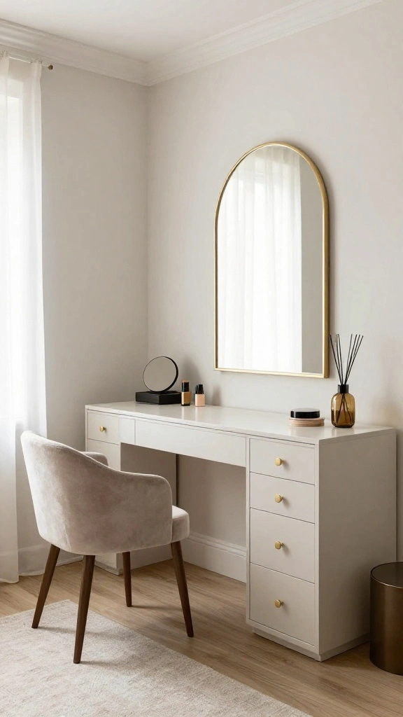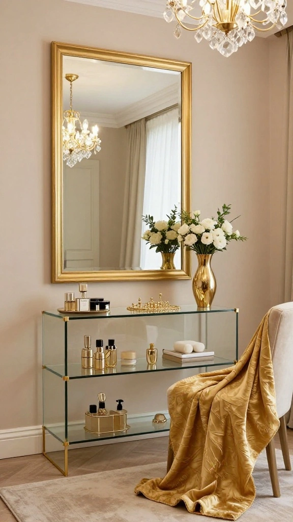 For a successful implementation, choose one or two standout pieces to keep the space from feeling cluttered. Use glass containers for organizing accessories to maintain a clean, polished look. Pair this aesthetic with neutral walls and rich fabrics to enhance warmth and sophistication.