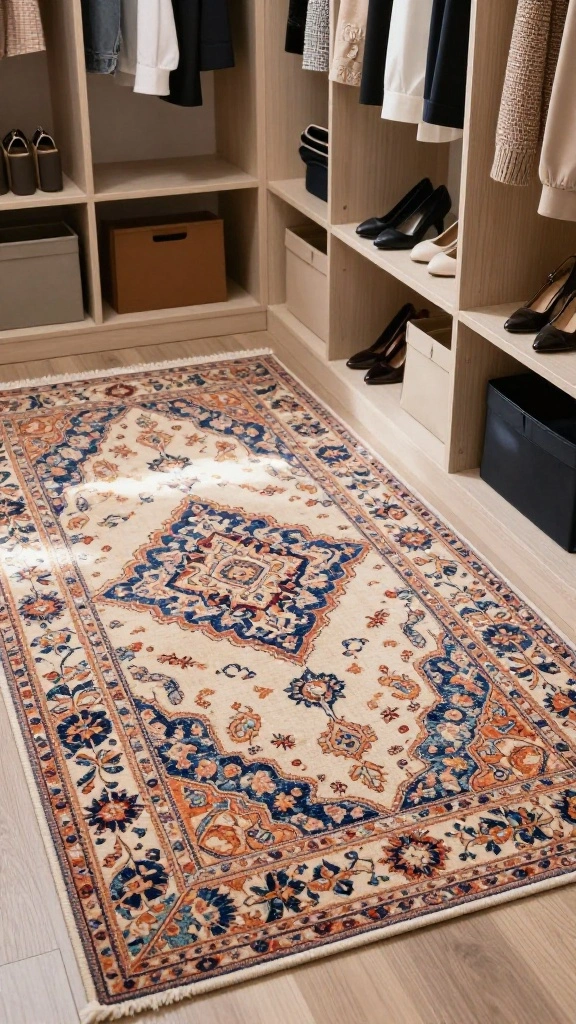 Incorporating a rug personalizes your dressing room closet, creating a warm and welcoming atmosphere.