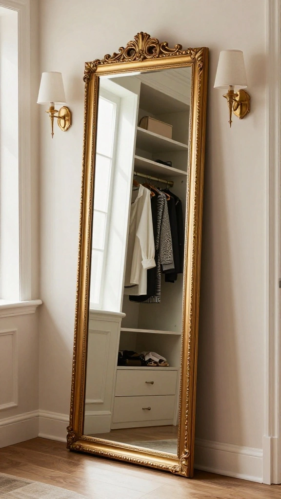 Incorporating a chic wall mirror into your dressing room closet adds both practicality and elegance. A well-placed mirror not only makes the space feel larger but also provides a convenient spot for outfit checks. Opt for a full-length mirror with a decorative frame that complements your existing decor. For a modern touch, consider leaning the mirror against the wall or installing mirrored panels for a sleek finish, reflecting light beautifully throughout the room.